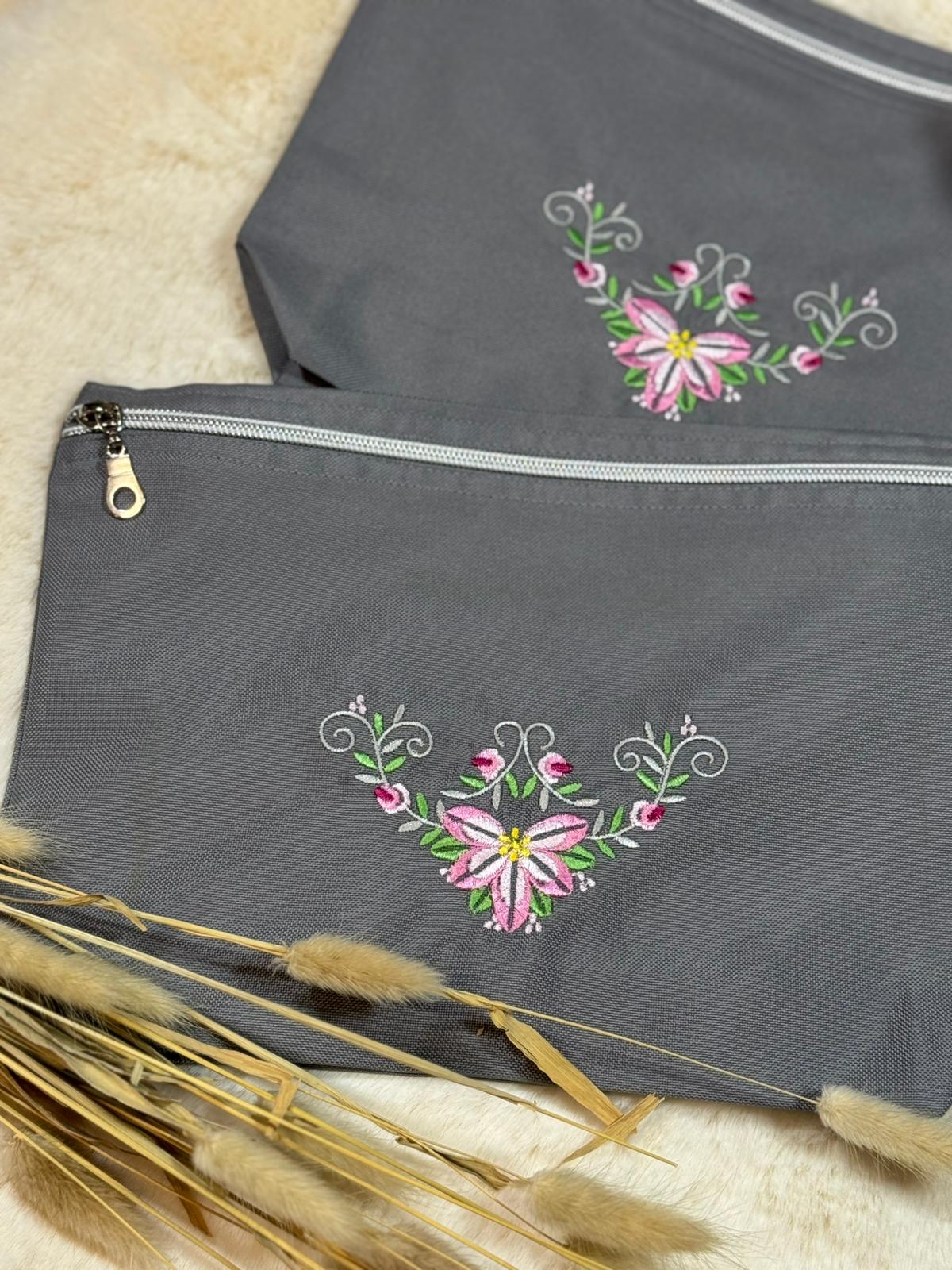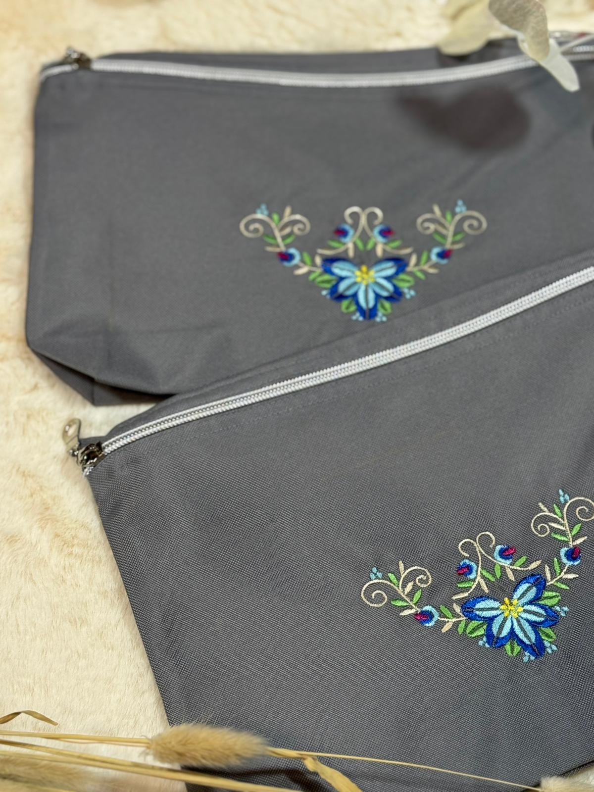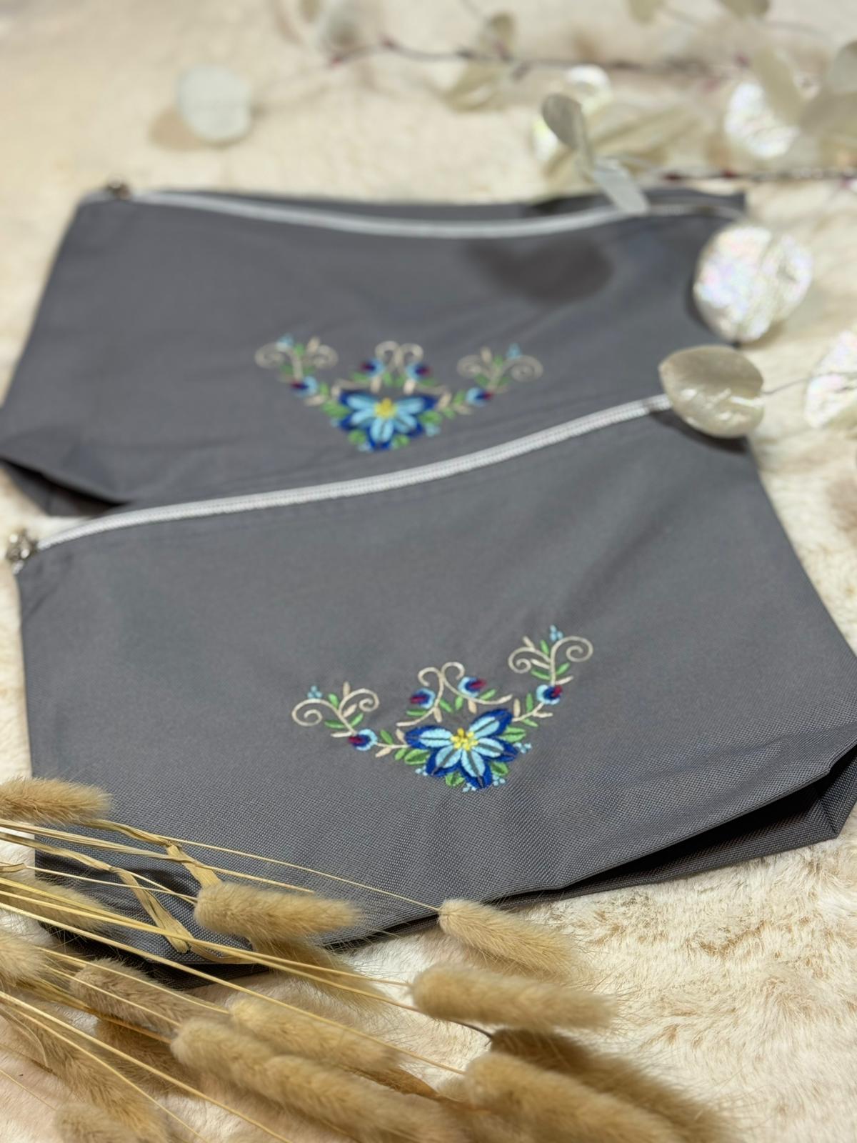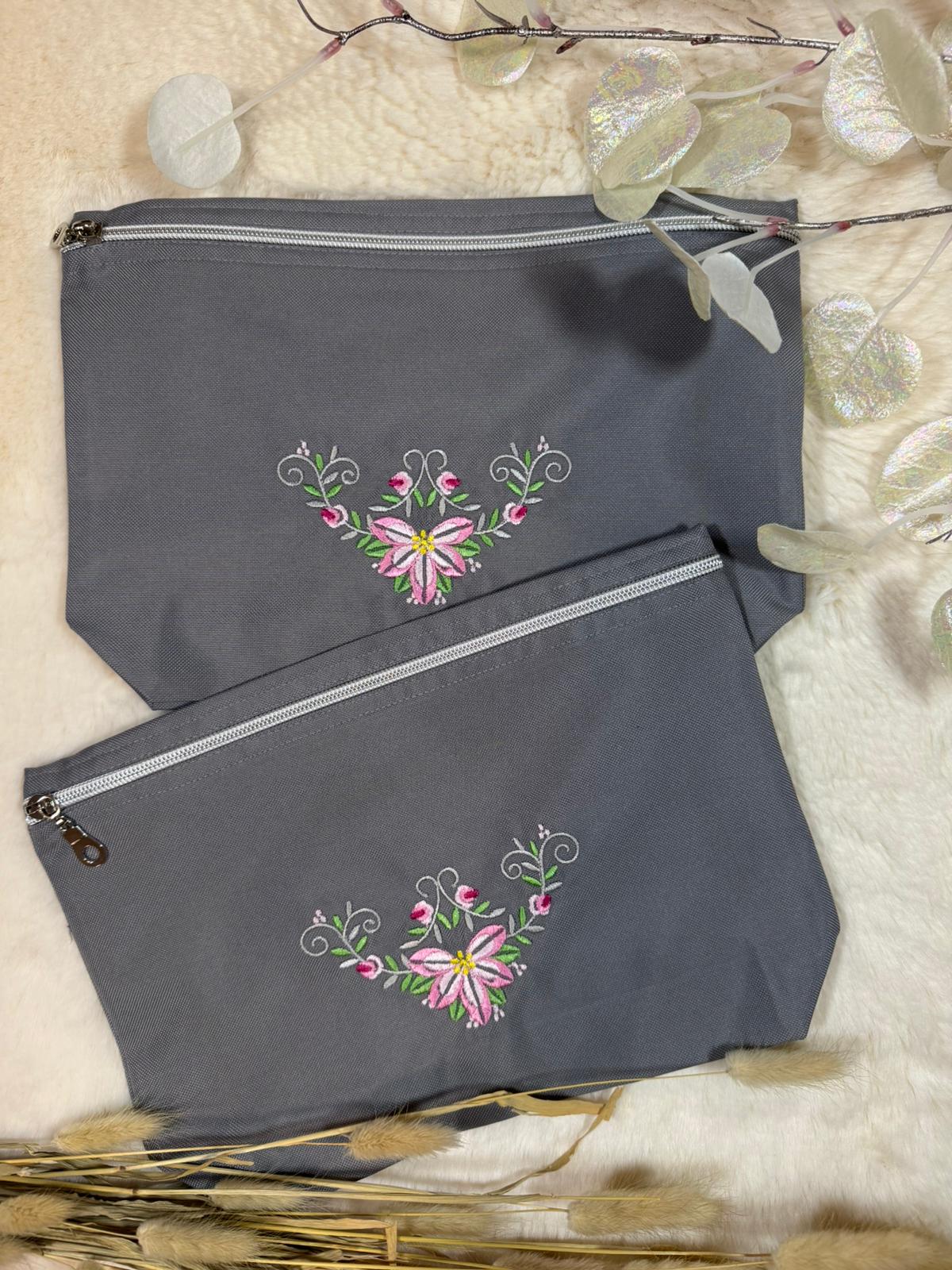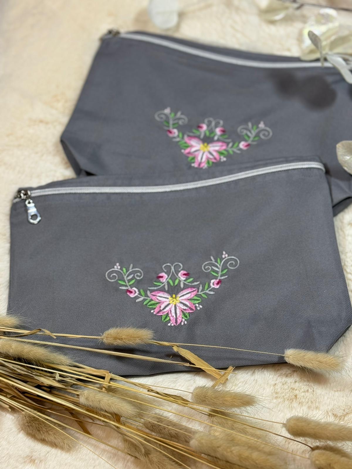Diese elegante Kosmetiktasche ist mit einer fein gearbeiteten floralen Stickerei verziert. Der silberne Reißverschluss setzt einen modernen Akzent und schützt deine Essentials zuverlässig. Ideal für Kosmetik, Reiseutensilien, Stifte oder kleine Alltagsbegleiter – stilvoll, praktisch und elegant. 100% handmade.